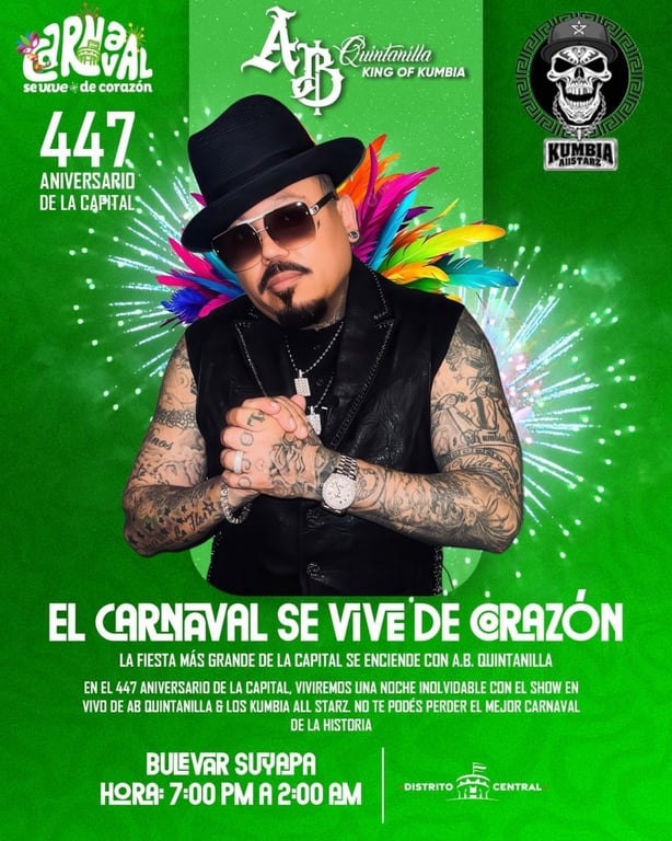 Como parte de la oferta musical internacional, también se presentará A.B. Quintanilla, reconocido como “El Rey de la Cumbia”, quien subirá al escenario en el bulevar Suyapa a partir de las 7:00 de la noche para interpretar sus mayores éxitos y sumarse a la celebración.