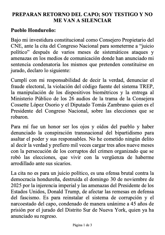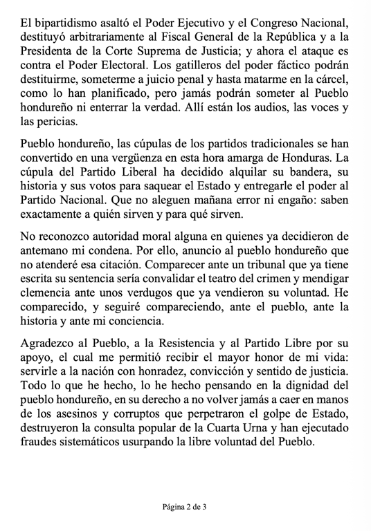 En su pronunciamiento, Ochoa también afirmó: “Cumplí con mi responsabilidad de decir la verdad, denunciar el fraude electoral”, y agregó que “comparecer ante un tribunal que ya tiene escrita su sentencia sería convalidar el teatro del crimen”, reiterando su rechazo al proceso y su postura de no someterse al mismo.