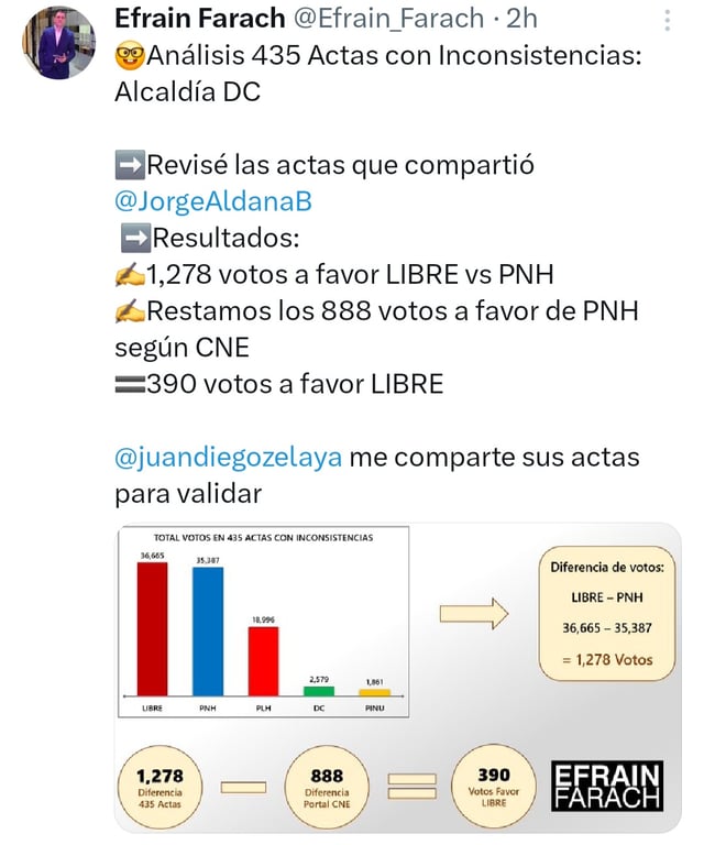 Según su revisión y análisis, los votos a favor de LIBRE en esas 435 urnas, suman 1,278. Restándole los 888 votos, que en la última actualización antes de la declaratoria oficicial del CNE, mantenia a favor Juan Diego Zelaya, deja un saldo final de 390 votos a favor del Candidato Jorge Aldana de LIBRE.