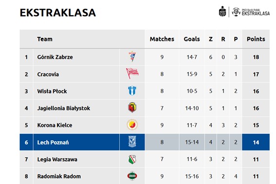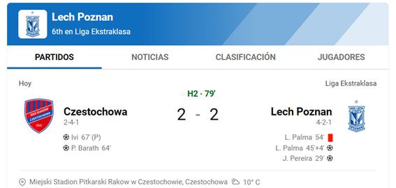 El equipo LECH POZNÁN estaría llegando a la 6ta posición en la principal liga Polaca.