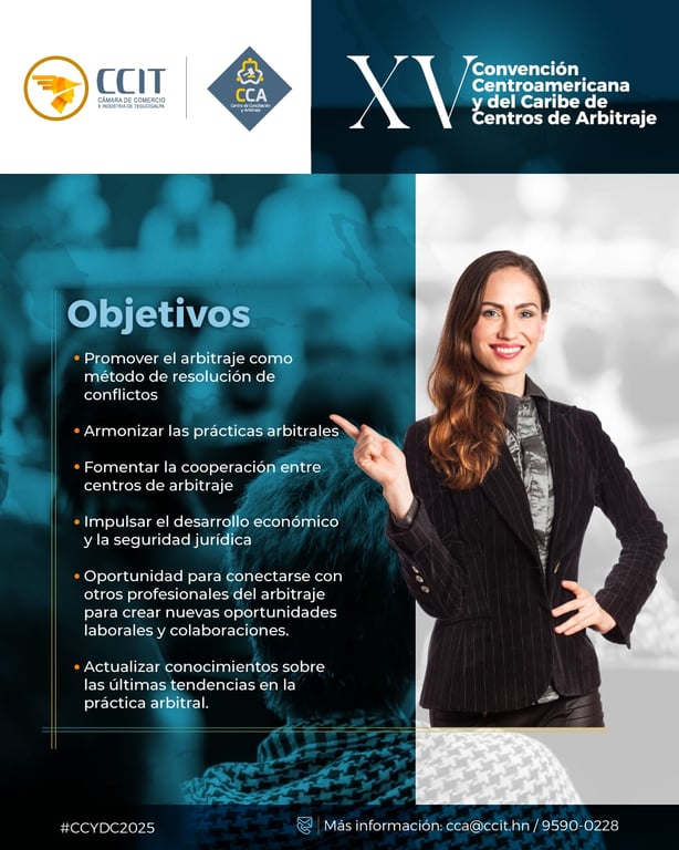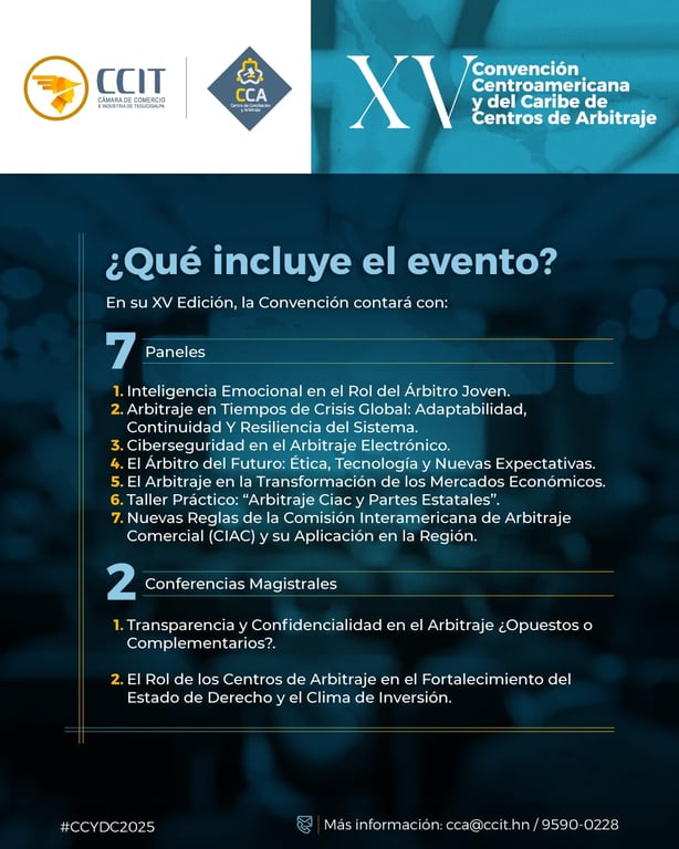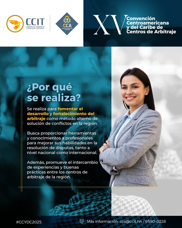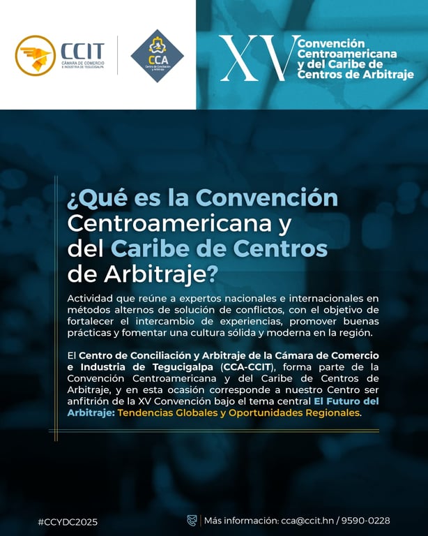 La Cámara de Comercio e Industria de Tegucigalpa (CCIT), a través de su Centro de Conciliación y Arbitraje (CCA), anunció que Honduras será anfitriona de la XV Convención Centroamericana y del Caribe de Centros de Arbitraje, programada para los días 28 y 29 de octubre en el Hotel Real Intercontinental de Tegucigalpa.