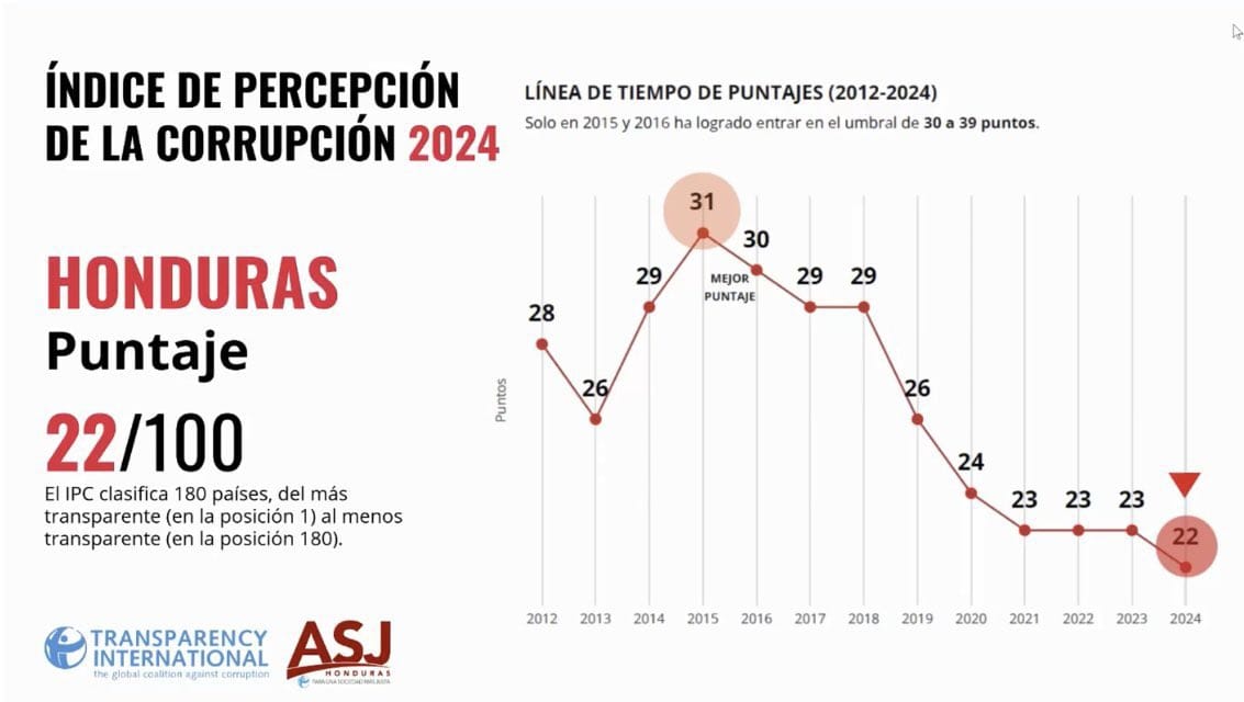 El índice mide la percepción sobre el nivel de corrupción en el sector público, tomando como referencia análisis de expertos y encuestas especializadas. La escala va de 0, que representa altos niveles de corrupción, a 100, que indica mayor transparencia. Con 22 puntos, Honduras se sitúa nueve puntos por debajo del promedio de Centroamérica, que es de 31.